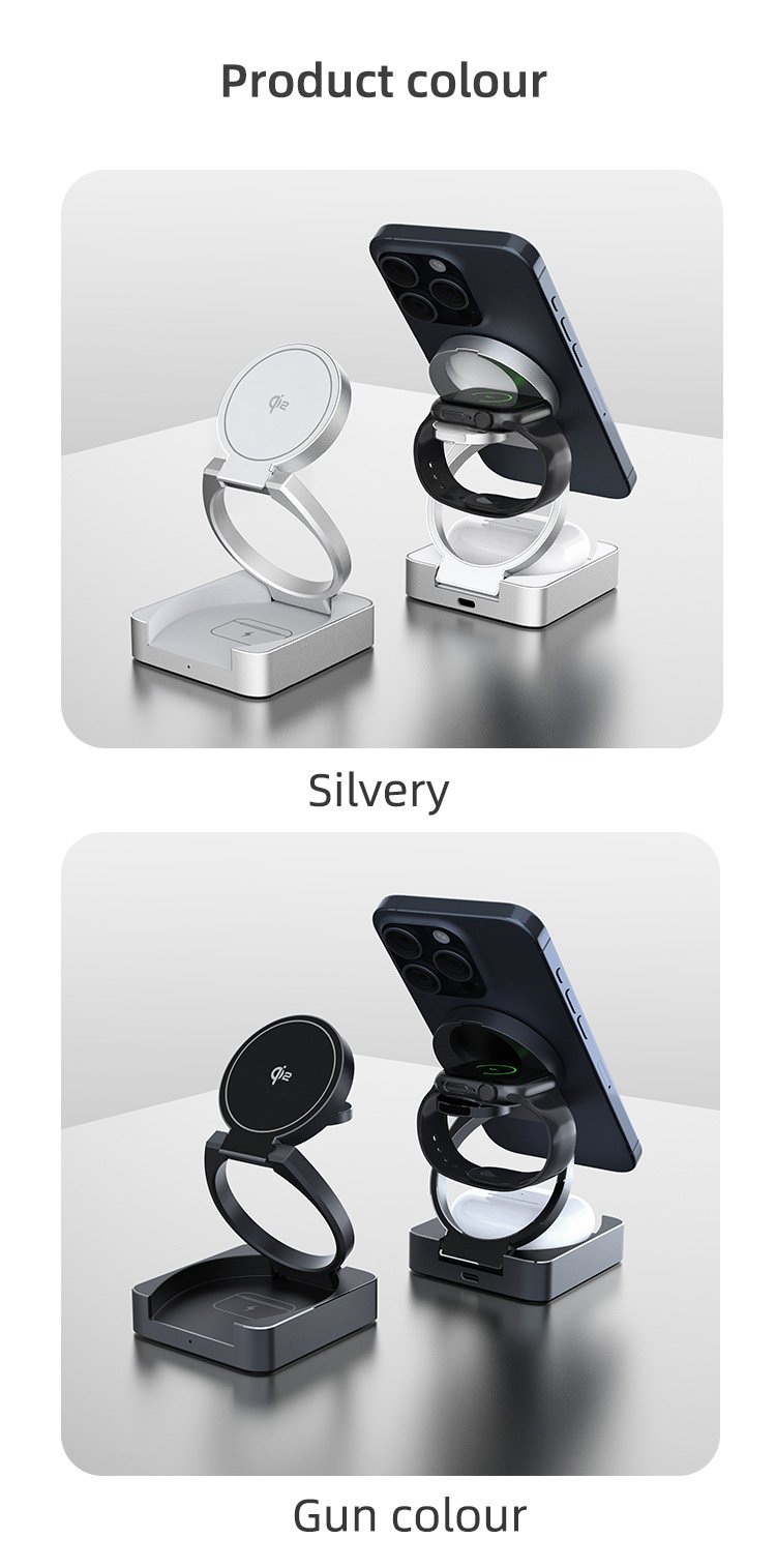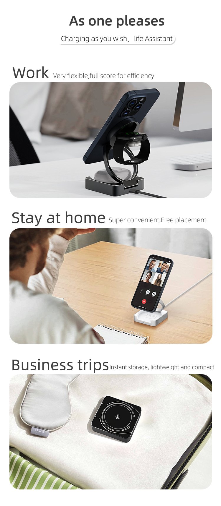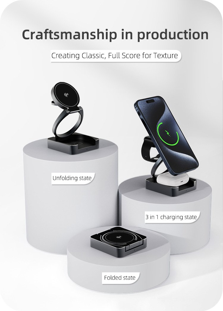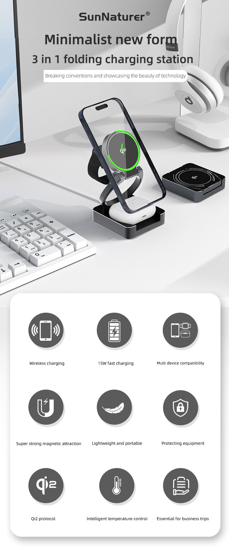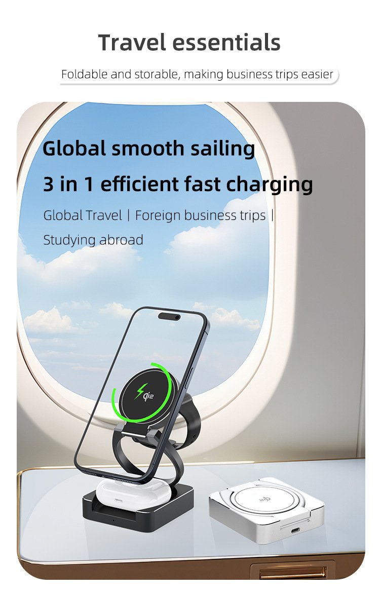 Qi2 3in1 Wireless Charging Folding Bracket Portable Travel Charger with QC3.0 PD 15W OTP OVP Multifunctional Charger